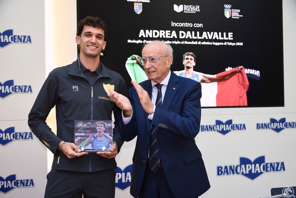 «Sono orgoglioso di essere d’esempio per tanti bambini e ragazzi che fanno sport. Lavorando sodo e credendo in quello che si fa si possono raggiungere i risultati sperati. E anche dalle batoste – come la mancata qualificazione alla finale delle Olimpiadi di Parigi – con il giusto atteggiamento si può ripartire e fare meglio, perché la vita offre sempre una seconda chance». Con queste parole Andrea Dallavalle, piacentino e vicecampione mondiale di salto triplo dopo la medaglia d’argento conquistata a Tokyo, ha salutato il pubblico del PalabancaEventi, dove è stato premiato con una targa ricordo dalla Guardia di Finanza e dal Coni e con un riconoscimento speciale da parte della Banca di Piacenza: una foto del campione scattata a Tokyo, riprodotta su supporto in vetro con l’iscrizione “Grazie Andrea”.