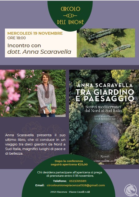 Mercoledì 19 novembre p.v. alle ore 18,00 il Circolo dell’Unione ospiterà Anna Scaravella, landscape designer, famosa in Italia e all’estero per aver creato incantevoli giardini.