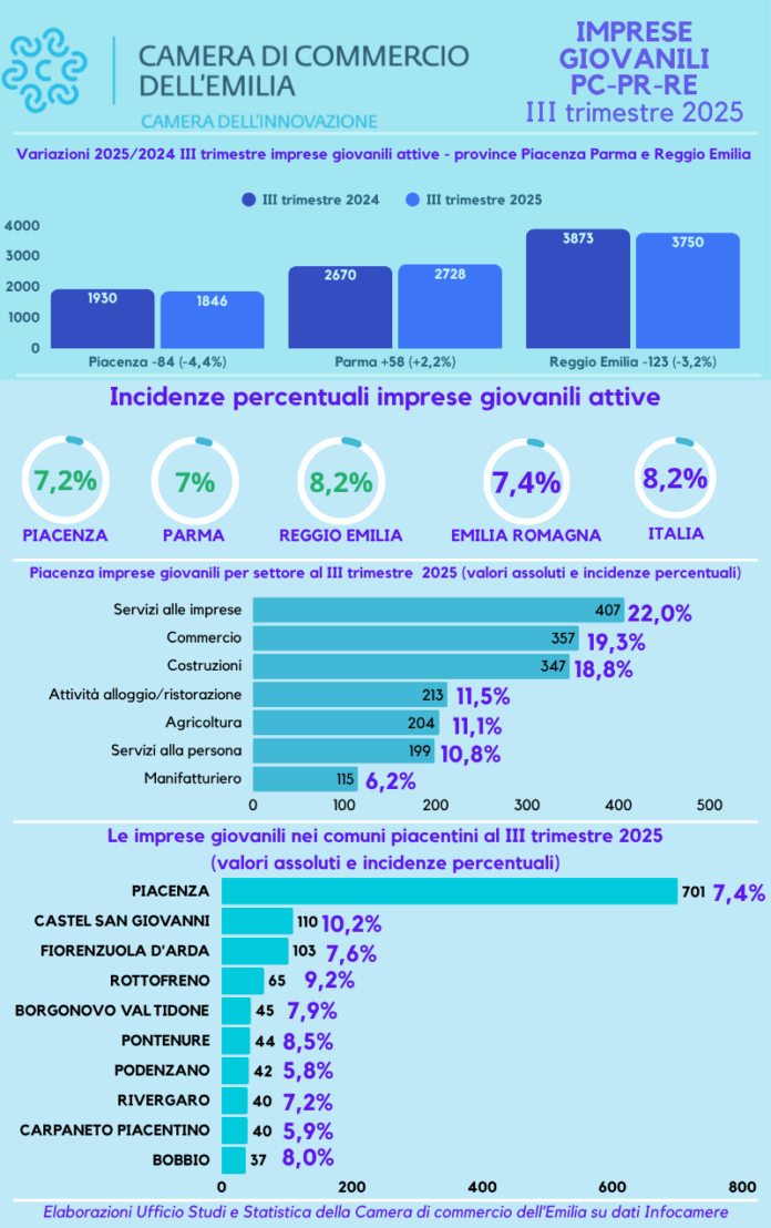 In termini di incidenza percentuale, però, il primato spetta a Ottone (7 imprese under 35, 11,7%), seguito da Morfasso (18, 11%) e Castel San Giovanni (110, 10,2%).