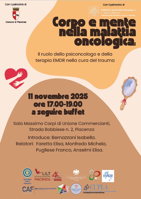 Si terrà martedì 11 novembre, presso la Sala Massimo Carpi di Piacenza, il convegno “Corpo e mente nella malattia oncologica. Il ruolo dello psiconcologo e della terapia EMDR nella cura del trauma”, rivolto alla cittadinanza e nato per far conoscere da vicino il lavoro degli psico-oncologi, figure specializzate che offrono supporto sia ai pazienti sia ai familiari lungo tutto il percorso della malattia.