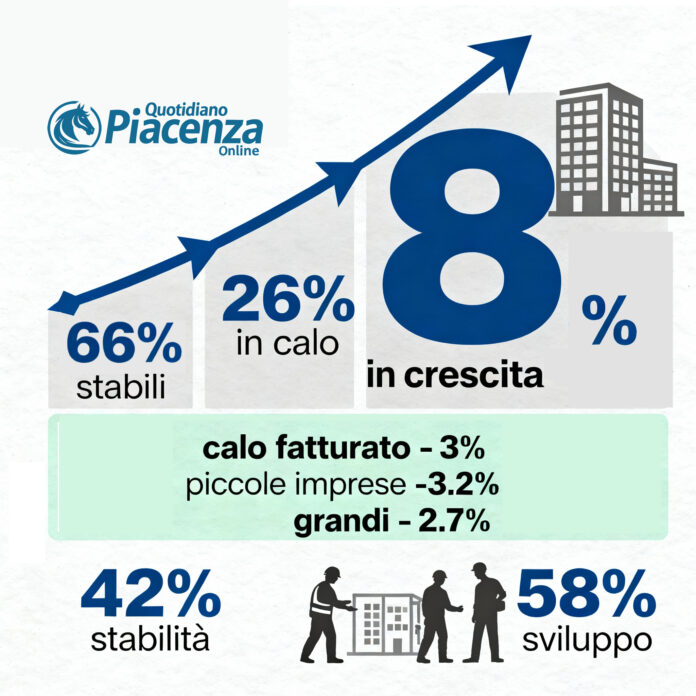 Sul fronte del fatturato, il comparto edilizio piacentino registra una flessione del 3% a confronto con il secondo trimestre dell’anno precedente, dato comunque leggermente migliore rispetto al -3,5% regionale. Per l’artigianato, la perdita si attesta al -3,6%. Il calo più rilevante riguarda le aziende con 1-9 addetti (-3,2%), mentre nelle imprese più strutturate la diminuzione si limita al -2,7%.