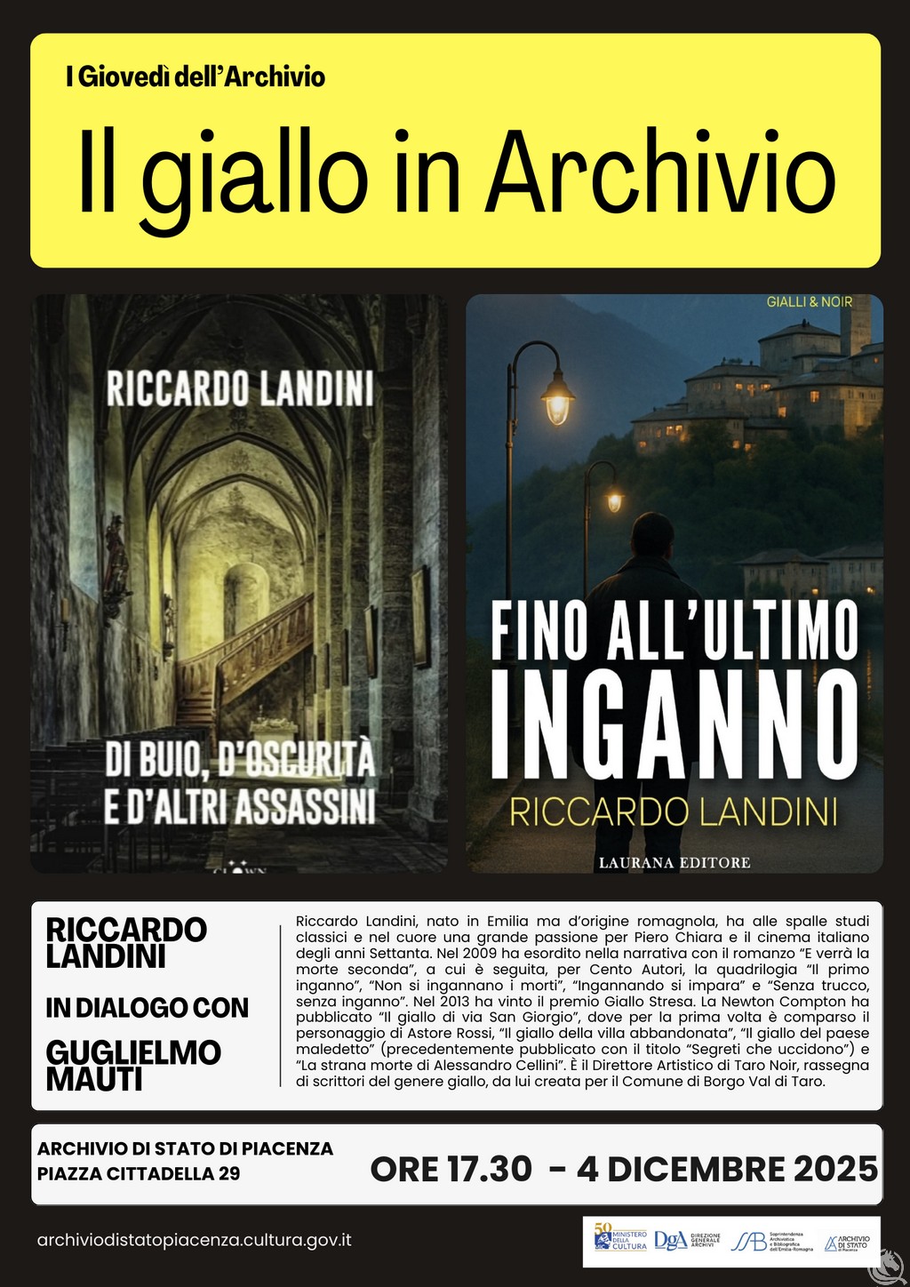 Giovedì 4 dicembre 2025, alle 17.30, l’Archivio di Stato di Piacenza (secondo piano di Palazzo Farnese) ospiterà un incontro per gli appassionati del giallo. Protagonista sarà lo scrittore Riccardo Landini, in dialogo con il giornalista Guglielmo Mauti, per un appuntamento intitolato “Il giallo in Archivio”.