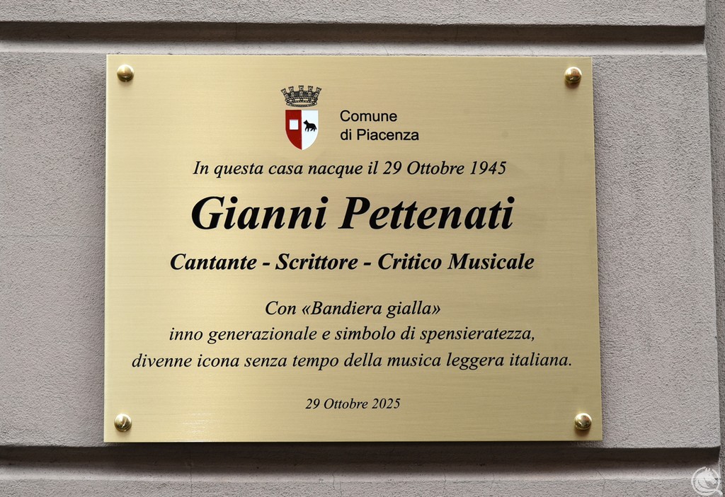 La “Bandiera Gialla” di Gianni Pettenati sventola oggi sulla sua casa natale a Piacenza. Una targa commemorativa è stata scoperta sulla facciata del civico 222 di via Roma, nel giorno in cui il cantante avrebbe compiuto 80 anni. “In questa casa nacque, il 29 ottobre 1945, Gianni Pettenati – Cantante, scrittore, critico musicale. Con ‘Bandiera Gialla’, inno generazionale e simbolo di spensieratezza, divenne icona senza tempo della musica leggera italiana”, recitano le parole incise, lette al microfono dal nipote Tommaso. Alla cerimonia hanno preso parte il sindaco Katia Tarasconi e i figli di Pettenati, Maria Laura, Samuela e Gianlorenzo, che hanno svelato l’omaggio della città al grande artista.