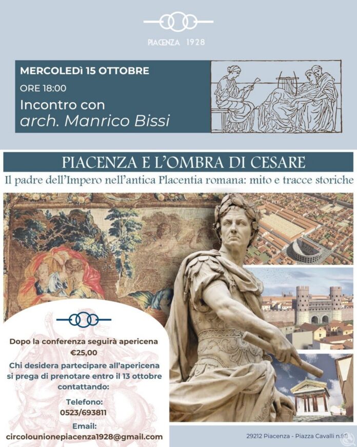 Mercoledì 15 ottobre, alle ore 18, il Circolo dell’Unione di Piacenza ospiterà l’architetto Manrico Bissi dell’associazione Archistorica per un incontro dal titolo “Piacenza e l’ombra di Cesare”. Un’occasione per riscoprire le radici romane della città attraverso un affascinante itinerario storico e archeologico.