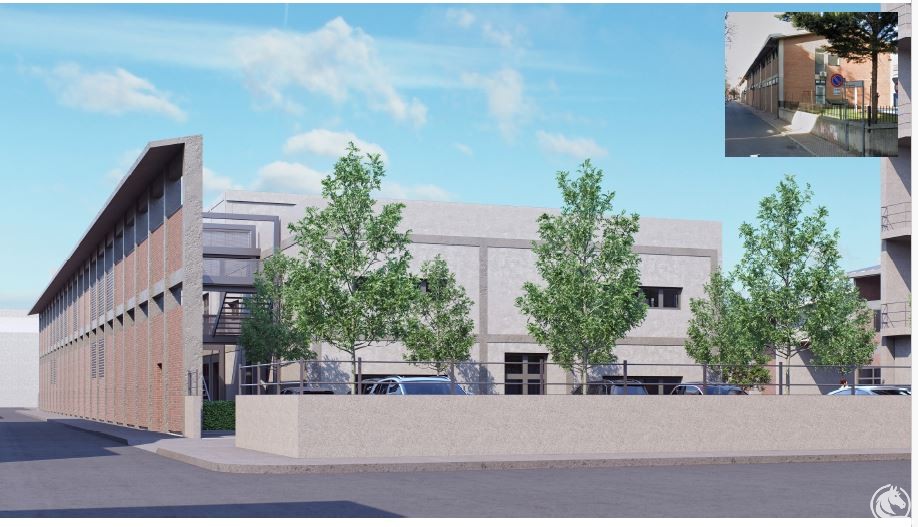 Degli attuali edifici (vedi foto qui sopra) l’edificio A, ex autorimessa verrà abbattuto fatto salvo per il muro di facciata che dà su via Rogerio che verrà conservato e che andrà a costituire una sorta di quinta rispetto al nuovo edificio che verrà arretrato di una decina di metri. Fungerà da barriera di protezione ed antirumore: vi sarà uno spazio verde a piano terreno, largo 5 metri, mentre al primo piano verranno costruiti dei terrazzi comuni fra più aule. Il nuovo stabile sarà più largo ma più corto di quello attuale.