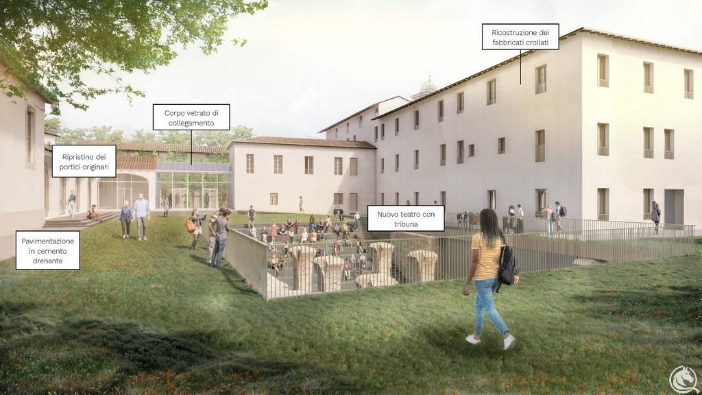 Il corpo est del complesso, ricostruito tra la fine del Settecento e l’inizio dell’Ottocento, che ha mantenuto meglio di tutte le altre parti le sue caratteristiche d’origine, verrà ricostruito insieme ai corpi nord, sud e ovest, maggiormente compromessi. La forma volumetrica e architettonica primordiale di queste strutture verrà ripristinata, ma adattata per rispondere alle nuove esigenze funzionali dell’immobile. Le arcate dei portici seicenteschi e ottocenteschi torneranno a essere dei percorsi coperti dei quali sarà nuovamente possibile apprezzare le peculiarità storico-architettoniche. Il corpo ovest sarà collegato all’edificio denominato “Bugandaia” e al portico adiacente tramite una struttura vetrata, che garantirà, così, un percorso dal chiostro continuo e coperto.