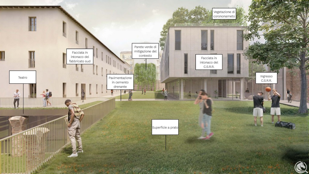I piccoli fabbricati bassi situati sul lato est del complesso saranno, invece, demoliti per far posto a una serie di residenze studentesche che avranno l’accesso diretto dal cortile.